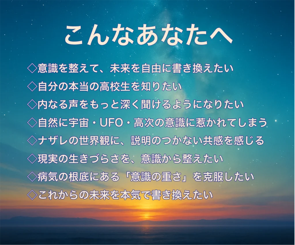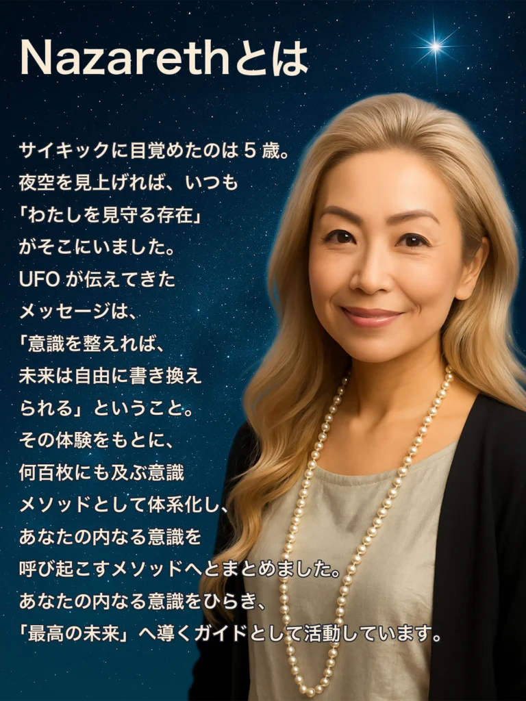 Nazarethとは サイキックに目覚めたのは5歳。夜空を見上げれば、いつも「わたしを見守る存在」がそこにいました。UFOが伝えてきたメッセージは、「意識を整えれば、未来は自由に書き換えられる」ということ。その体験をもとに、何百枚にも及ぶ意識メソッドとして体系化し、あなたの内なる意識を呼び起こすメソッドへとまとめました。あなたの内なる意識をひらき、「最高の未来」へ導くガイドとして活動しています。 SOUL DYNAMIC ASSOCIATION 主宰 ライフスタイルコーチ-サイキック意識ガイドコンサルタント 潜在意識(未来映像)リーダー ビジネスコンサルタント LA・NY・日本を拠点に活動中 こんなあなたへ ◇意識を整えて、未来を自由に書き換えたい◇自分の本当の高校生を知りたい◇内なる声をもっと深く聞けるようになりたい◇自然に宇宙・UFO・高次の意識に惹かれてしまう◇ナザレの世界観に、説明のつかない共感を感じる◇現実の生きづらさを、意識から整えたい◇病気の根底にある「意識の重さ」を克服したい◇これからの未来を本気で書き換えたい 初回セッションに申し込む 60分/5,500円の意識ガイダンスセッション通常33,000円のセッションの初回限定価格 無料ガイダンス動画を受け取る メールにてYouTube非公開動画のURLをお送りします Nazareth's Services 初回セッションでできること あなたの「意識指数(Inner Frequency)」を 測り、これまでの人生であなたを静かに妨げてきた根本をナザレのテレポートで浄化します。 テレポートを受けるワークを通して、あなたの意識指数が上がり、未来へ向かう周波数が静かに、確実に切り替わりはじめます。その瞬間から、あなたの人生は「頑張らなくても」幸せへと導かれ、運命の舵がやわらかく自然に切りはじめるのです。 Nazarethメッセージ あなたの内なる意識がひらいた瞬間、未来はあなたを迎えに来ます。 内なるあなたと繋がった瞬間、未来はその映像に向けて静かに 動きはじめます。その道を照らすガイドとして、あなたの旅に寄り添います。 お客様の声 Aさん(40代・会社経営)「ずっと苦しかった人生のパターンが、静かに書き換わりました。」初回セッションで「意識指数」を測ってもらった瞬間、自分では気づけなかった「根の部分」がすっと浮かび上がりました。ナザレ先生のテレポートワ ークは本当に不思議で、終わったあと、頭の雑音が消え未来の選択肢が軽く開けていく感覚がありました。翌週には長年止まっていた案件が自然に動き出し、「周波数って本当にあるんだ」と実感しました。 Sさん(40代・女性・OL) 親子関係が驚くほど改善しました。私は長い間、母親が苦手でした。できるだけ距離を置き、関わらないように生きてきました。初回セッションで、ナザレ先生が「母を苦手に感じる根本理由」をやさしく、そして的確に教えてくださり、その瞬間、深い部分で腑に落ちました。それから不思議と、母との関係に無理のない変化が起き始めました。気づけば、心の緊張がほどけ、親子関係に静かなあたたかさが戻り今では仲良し母娘です。 Tさん(30代・女性・クリエイター)「頑張らなくても、流れが勝手に良い方向へ向かいはじめた。」これまでスピリチュアルは少し怖かったのですが、ナザレ先生の世界観はよくあるスピリチュアルとは異なり、「本質と才能」を呼び起こすという説明にすごく安心しました。セッション後、人間関係の悩みが驚くほど軽くなり、自分の本来の感性を取り戻した感覚があります。無理に頑張らなくても、自然と良いことが起こる流れにのれるようになりました。 初回セッションに申し込む SOUL DYNAMIC ASSOCIATION by attenda Inc. 本サービスは医療上位ではありません。効果には個人差があります。 見えない世界へとつながり、 「本来のあなた」へ戻るための意識ガイド SOUL DYNAMIC ASSOCIATION 主宰 ライフスタイルコーチ-サイキック意識ガイドコンサルタント 潜在意識(未来映像)リーダー ビジネスコンサルタント LA・NY・日本を拠点に活動中 初回セッションに申し込む 60分/5,500円の意識ガイダンスセッション通常33,000円のセッションの初回限定価格 無料ガイダンス動画を受け取る メールにてYouTube非公開動画のURLをお送りします Nazareth's Services 初回セッションでできること Nazarethメッセージ お客様の声 Aさん(40代・会社経営)「ずっと苦しかった人生のパターンが、静かに書き換わりました。」初回セッションで「意識指数」を測ってもらった瞬間、自分では気づけなかった「根の部分」がすっと浮かび上がりました。ナザレ先生のテレポートワ ークは本当に不思議で、終わったあと、頭の雑音が消え未来の選択肢が軽く開けていく感覚がありました。翌週には長年止まっていた案件が自然に動き出し、「周波数って本当にあるんだ」と実感しました。 Sさん(40代・女性・OL) 親子関係が驚くほど改善しました。私は長い間、母親が苦手でした。できるだけ距離を置き、関わらないように生きてきました。初回セッションで、ナザレ先